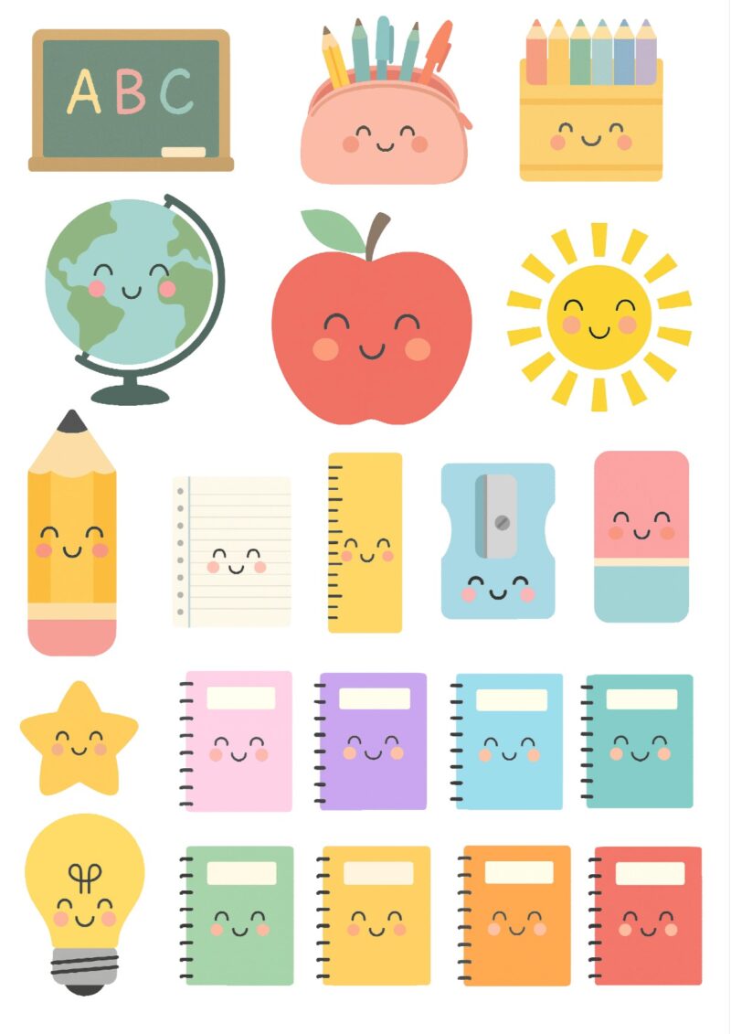 Coleção fofa com lousa, estojo, lápis de cor, lápis e outros itens escolares, ideal para Dia dos Professores e volta às aulas. Perfeito para impressão, DTF-UV, adesivos, scrapbooking, lembrancinhas, planners e projetos criativos.
